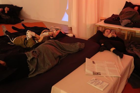 The Sleepover Experiment, a one night exhibition hosted by Annika Larsson. The exhibition took place over the course of 12 hours to which 20 artists, researchers, writers and students were invited to participate in a series of openly choreographed acts, conversations, performances, sounds and moving images which aimed to challenge the very notion of ourselves as autonomous and in control.