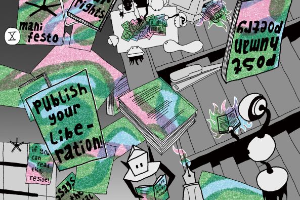 Through workshops, editing sessions, and long conversations, the boards used publishing to organise themselves, choosing what should be said and who gets to speak. Interviews, comics, role-play manuscripts, and speculative writing move through the pages, and one section even imagines books in the year 2125. Reading appears here as a social practice: something done with others rather than alone.