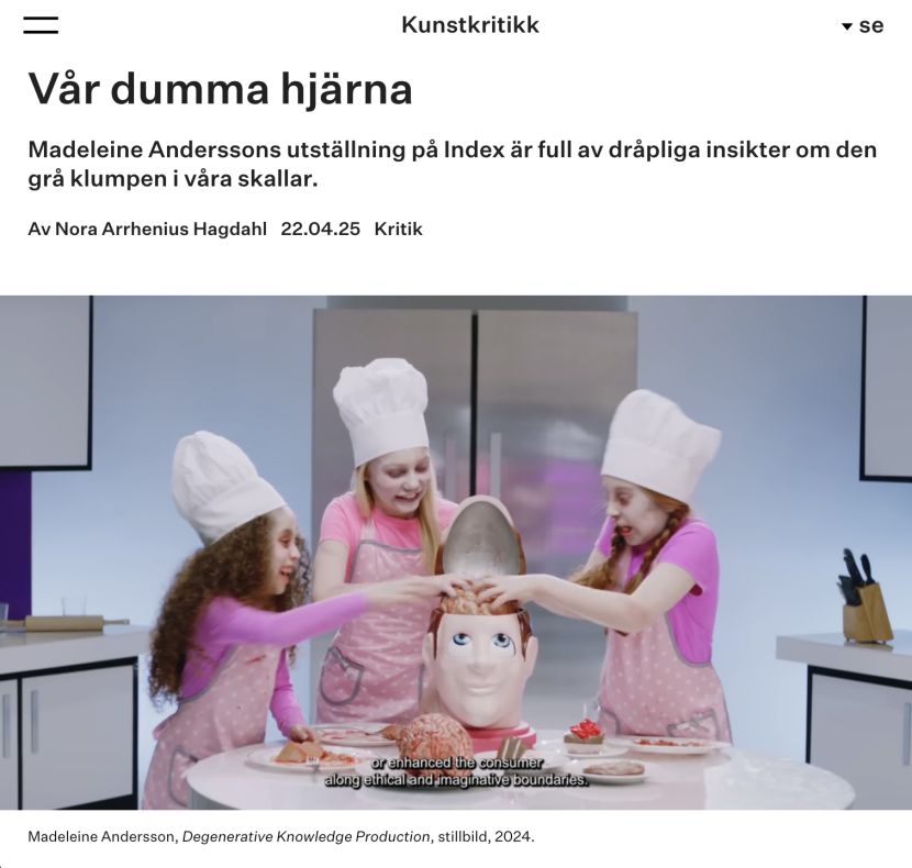 “The exhibition is at its strongest when I am completely enveloped in my own human consciousness – one that is not defined by a uniquely brilliant train of thought but by the potential to behave completely idiotically and still be able to laugh at it. When I stumble away, dazed, it is with the turbulent feeling of being stupid along with the «makes you think» meme spinning around in my head. Or as they say in the film (Degenerative Knowledge Production, 2024): «Trillions are spent on trying to argue the smarts, yet no one can define what it truly means to be stupid».”